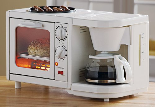 Brews 4 cups of coffee, toasts bread, and the pan on top warms sausages or eggs. Toaster oven has baking rack and tray, 15-min. timer. Carbon steel/glass/plastic. 16 3/4"L x 9"W x 9 3/4"H....